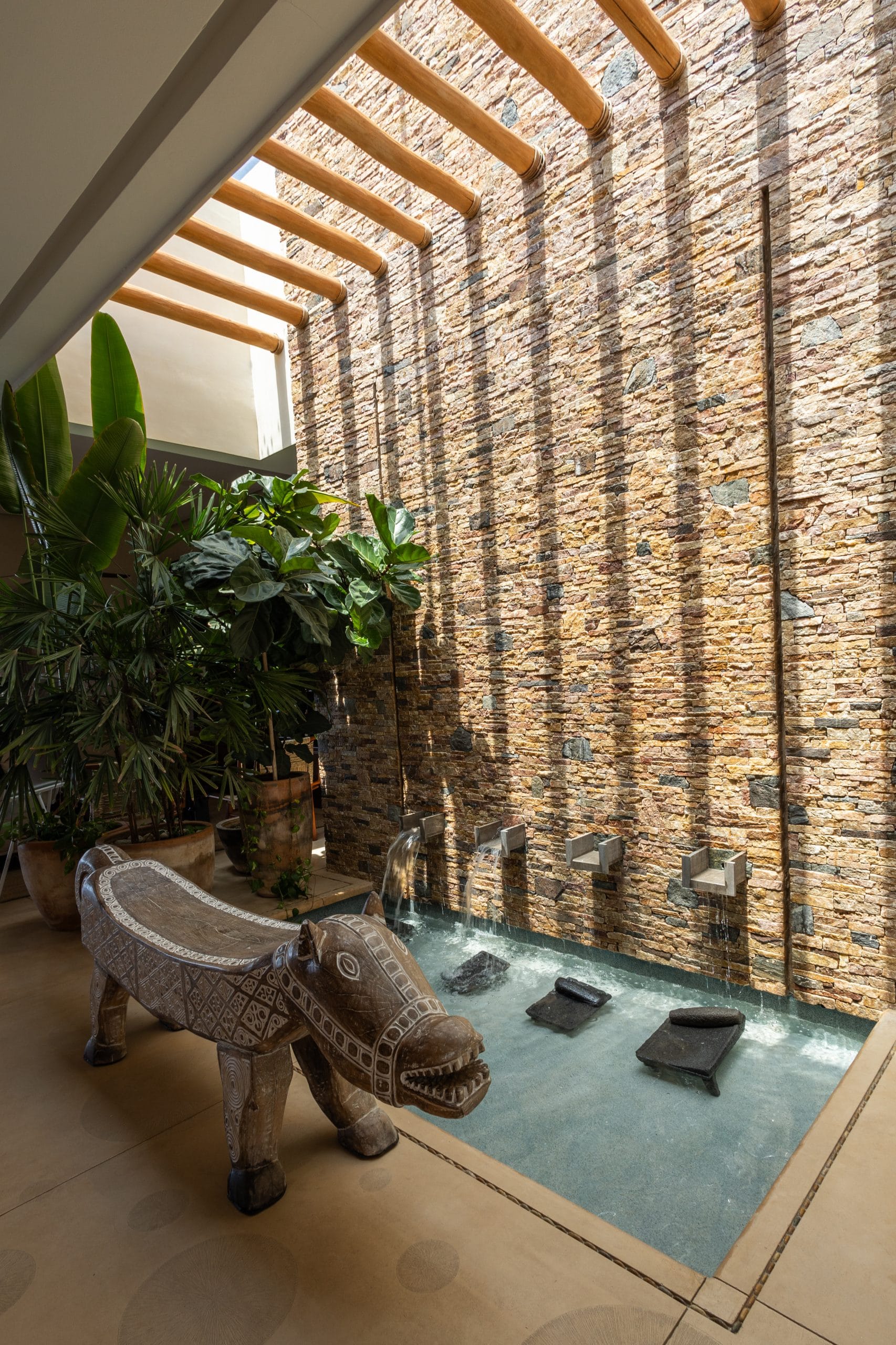 Minimalist tropical luxury with warm woods, natural textures, soft lighting, and an emphasis on grounding and spaciousness.